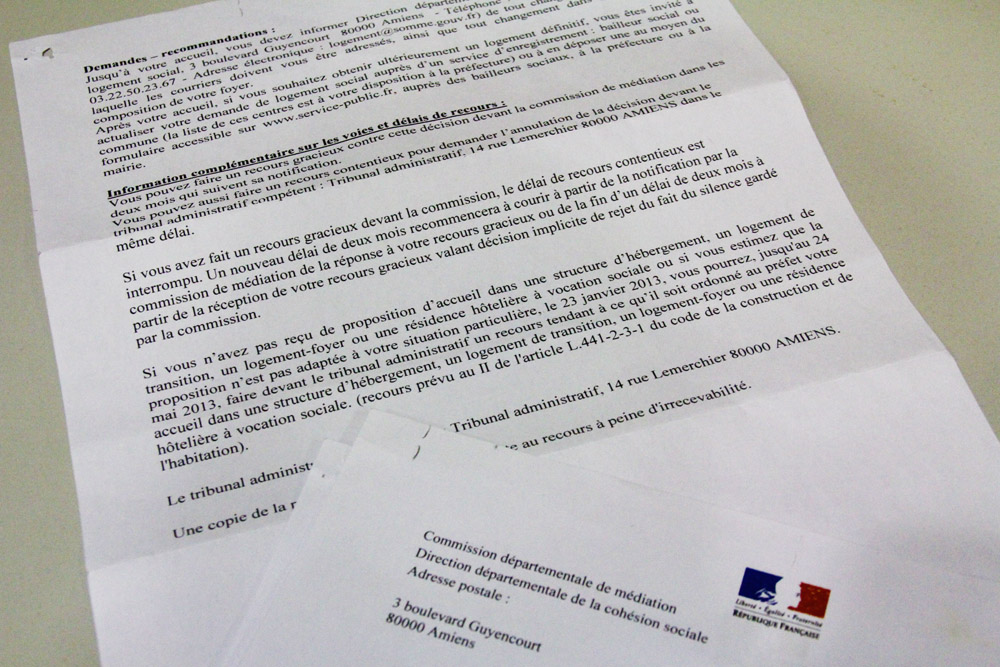 Pourtant, pendant le mois de décembre, un espoir est venu éclairer leur situation plus que sombre. Un courrier d'un service de la préfecture: la Direction départementale de la cohésion sociale (DDCS). Après avoir quitté leur logement, le couple a mené un recours devant la commission départementale de médiation de cette DDCS.
