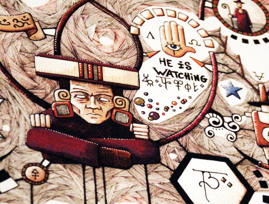 J'utilise l'ultraréalisme pour montrer la violence que le corps subit. Pour la technique, c'est un rotring, un stylo à l'encre de chine très fin, on appelle aussi ça "isographe". Il y a aussi des interventions à la plume. J'utilise l'isographe car c'est une technique difficile qui demande beaucoup de temps. Comme je décris une lutte, de la souffrance, ça prend du sens: pour moi la technique doit approcher le sens de l'œuvre.