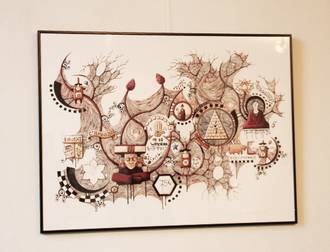«Il s'appelle "01" parce qu'il y en a un deuxième du même nom, exposé juste à côté. Le sens? Il y a beaucoup d'éléments divers, figuratifs, ce sont souvent des symboles, inspirés de cultures différentes. Des hiéroglyphes, des symboles du bouddhisme et de différentes religions, mais je laisse à chacun le soin d'interpréter.