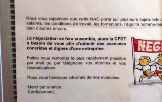 Premier contact chez Médiamétrie: c'est le délégué CFDT qui nous explique que chez Médiamétrie, le problème de climatisation est en passe d'être résolu mais qu'il va se renseigner auprès de la direction pour savoir s'il peut en parler. Étonnant. Puis une discussion normale se poursuit, pendant laquelle il nous explique que la CFDT n'est pas en conflit avec la direction et que les négociations annuelles obligatoires (NAO) en cours devraient se passer sans encombre.